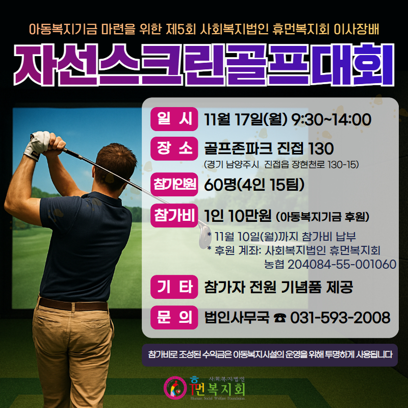 2025년 11월 17일(월), 사회복지법인 휴먼복지회에서는 아동복지기금 마련을 위한 제5회 사회복지법인 휴먼복지회 이사장배 자선스크린 골프대회가 개최될 예정입니다.